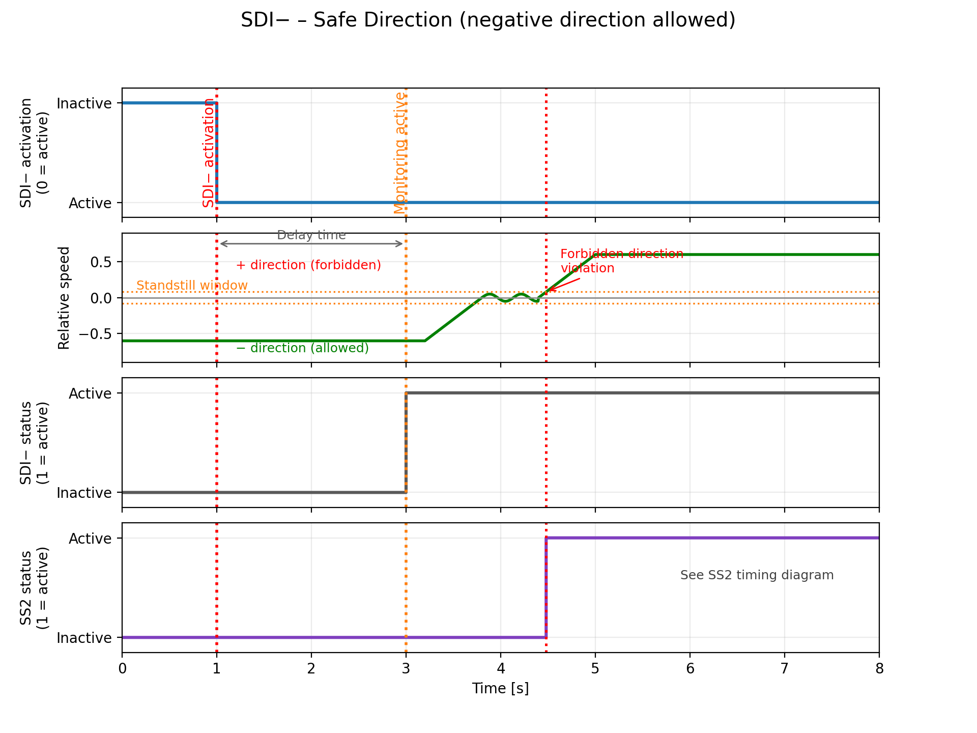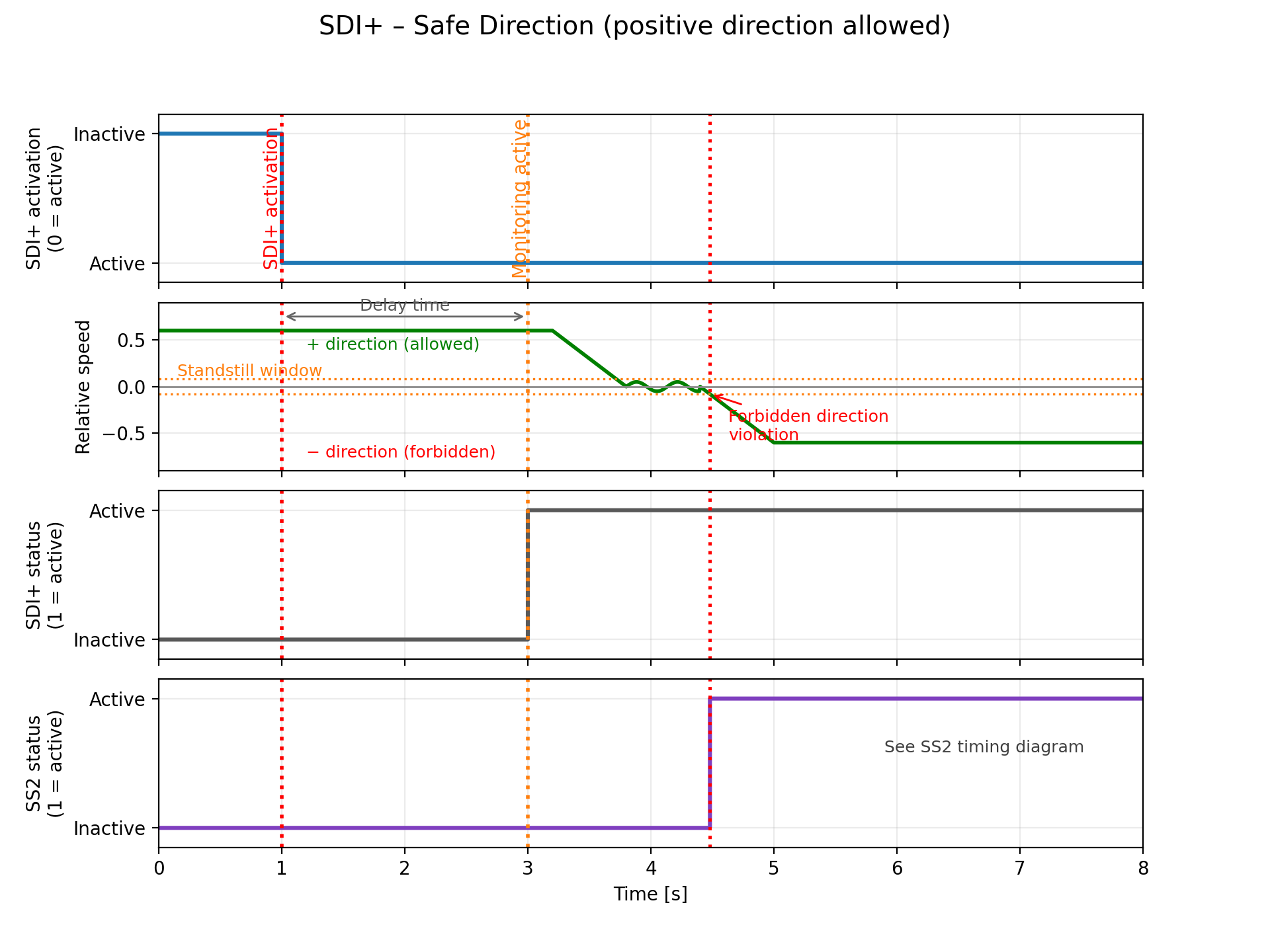 The SDI function can be activated by PROFIsafe control word only. There are two options for the direction monitoring: SDI+ and SDI-. If SDI+ is selected, the allowed direction is positive and the forbidden direction is negative. If SDI- is selected, the allowed direction is negative and the forbidden direction is positive.
