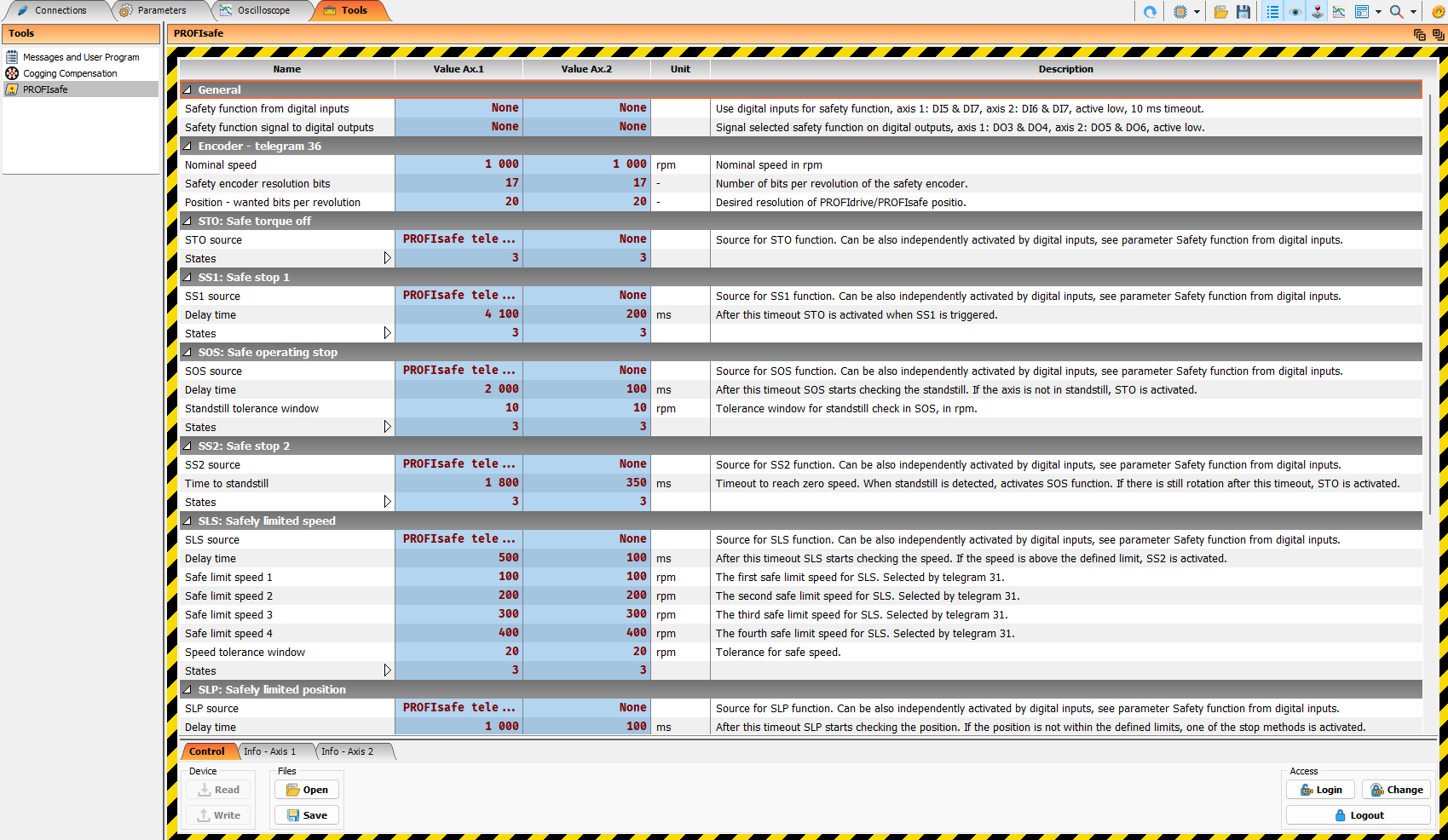 Two of the safety functions can be also selected permanently via the safety parameters: Safe limit speed (SLS) and safe limit position (SLP). The SLS can work simultaneously with the PROFIsafe control – selection of up to four different limited speed percent values is possible by telegram 31. On the other hand, the permanent SLP activated by DI uses always the safety position 1 only.